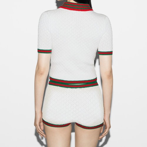 【服装】GUCCI/古驰24新款 女士白色棉质蕾丝条纹半扣领短袖Polo衫(衣服)782324XKD3C9074
