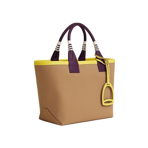 【新品包包】HERMES/爱马仕24新款 女士栗色帆布黄色皮马镫型手提包H083618CKAC